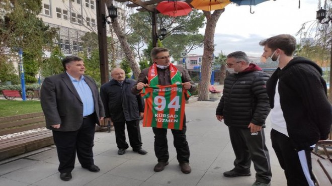 Bir sonraki durak olan Maden Şehitleri parkını ziyaret eden Tüzmen’e Kınık Belediyespor antrenörü ve sporcuları tarafından atkı ve ismi yazılı olan forma hediye edildi.