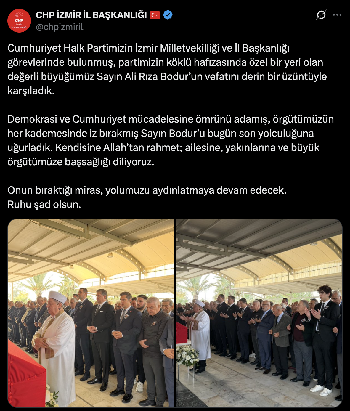 CHP İzmir İl Başkanlığı'ndan Bodur'un cenaze törenine ilişkin veda notu paylaşıldı. CHP İzmir'in sosyal medya hesabından yapılan paylaşımda, "Cumhuriyet Halk Partimizin İzmir Milletvekilliği ve İl Başkanlığı görevlerinde bulunmuş, partimizin köklü hafızasında özel bir yeri olan değerli büyüğümüz Sayın Ali Rıza Bodur’un vefatını derin bir üzüntüyle karşıladık. Demokrasi ve Cumhuriyet mücadelesine ömrünü adamış, örgütümüzün her kademesinde iz bırakmış Sayın Bodur’u bugün son yolculuğuna uğurladık. Kendisine Allah’tan rahmet; ailesine, yakınlarına ve büyük örgütümüze başsağlığı diliyoruz. Onun bıraktığı miras, yolumuzu aydınlatmaya devam edecek. Ruhu şad olsun" denildi.