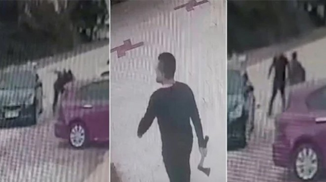 Olayın gerçekleştiği binanın güvenlik kamerasına yansıyan görüntülerde İ.A.’nın baltayı alıp kiracısı ve yanında bulunan kişilere doğru gittiği, balta ile vurduğu anlar yer aldı. (DHA)