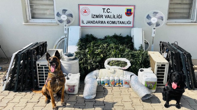 Şüphelinin evine yapılan baskında, depo bölümünde iklimlendirme sistemiyle kenevir yetiştirme düzeneği tespit edildi.