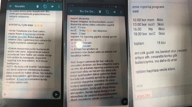 Paylaşılan mesajlarda, tutuklu yakınlarının röportaj vermeleri için ikna edilmesi istenirken, örgüt üyelerine röportaj sayısı için "gazete aboneliği", "mağdur zarfı" ve "himmet" gibi para toplama konularında olduğu gibi hedef konulması dikkati çekti.