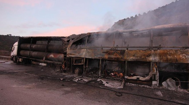 Saat 05.30 sıralarında meydana gelen kaza nedeniyle otobüste yangın çıktı.