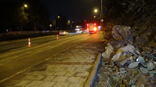 Bayraklı ilçesi altınyol mevkisinde yağmur sularının etkisiyle dağ yamacından kopan kaya parçaları yolu kapattı. Kaya parçalarının düştüğü Altınyol kara yolu kısmi olarak ulaşıma kapandı. Yoldan geçen sürücülerin ihbarı üzerine, bölgeye gelen polis ve belediye ekipleri, ulaşımı tek şeritten kontrollü olarak sağladı. Olay sırasında bölgeden geçen araç olmaması sayesinde herhangi bir kaza yaşanmadı. Ekipler, yolun açılması için çalışma başlattı. (DHA)