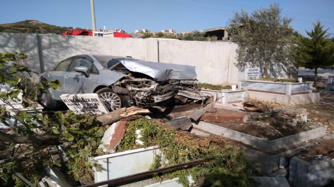 Kaza, gece saatlerinde Harmandalı Mahallesi, Anadolu Caddesi'nde meydana geldi. Ulukent'ten Çiğli yönüne giden O.A.'nın kullandığı otomobil, sürücüsünün direksiyon hakimiyetini kaybetmesiyle kontrolden çıkıp, Harmandalı Mezarlığı'na girdi. Otomobil sürücüsü kazayı ufak sıyrıklarla atlatırken, 6 mezar zarar gördü. Kazayı gören diğer araç sürücülerinin ihbarı üzerine bölgeye 112 Acil Servis ve polis ekipleri sevk edildi. Otomobil çekiciyle kaza yerinden kaldırılırken, polis O.A.'yı ifadesine başvurmak üzere polis merkezine götürdü. Öte yandan zarar gören mezarlardaki kişilerin yakınlarına durumu bildiren polis, kazayla ilgili soruşturma başlattı. (DHA)