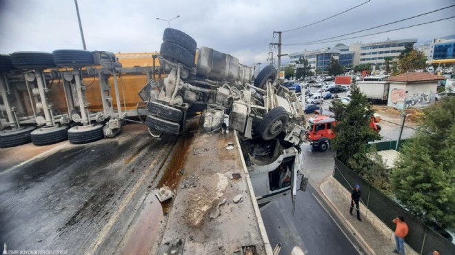 Kaza, saat 10.00 sıralarında Ankara Caddesi 4 Sanayi Üst Viyadüğü'nde meydana geldi. Bornova'dan Alsancak Limanı yönüne giden İrfan Öngen’in kullandığı 06 FGT 332 plakalı taş yüklü TIR, yağmur nedeniyle kayganlaşan yolda sürücüsünün direksiyon hakimiyetini kaybetmesiyle devrildi. TIR'ın kupası viyadüğe asılı kalırken, şoför Öngen ise yaralandı.