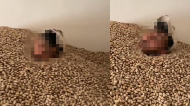 O anlar cep telefonu kamerasına yansırken, depolanan fıstığın içine giren kişi, tepkiler sonrası paylaştığı görüntüleri sildi.