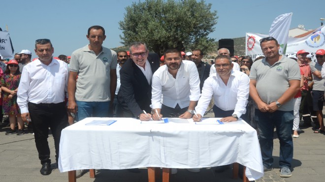 696 sayılı KHK ile sürekli işçi kadrolarına geçişleri yapılan Bağ-Kent Şirketi işçileri için hazırlanan sözleşme; Foça Belediye Başkanı Fatih Gürbüz, DİSK Genel-İş Genel Sekreteri Şükret Sevgener ve Disk-Genel İş Sendikası İzmir 4 No’lu Şube Başkanı Aydın Tekin tarafından imzalandı.