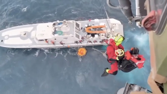 "Foça ve Karaburun arasında battığı bildirilen göçmen botu için Hava Kuvvetleri Komutanlığımıza bağlı helikopterimiz bölgeye intikal ettirildi. Şiddetli rüzgar, sağanak yağış ve yüksek dalgalı denize rağmen, denizden kurtarılan iki kazazede Ege Üniversitesi Hastanesi acil ekiplerine teslim edilerek görev başarıyla tamamlandı."