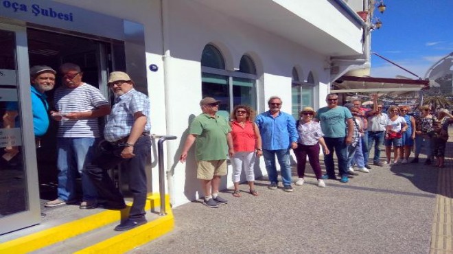 Çoğunluğunu bir süre önce kurulan Foça'ya Sahip Çıkıyoruz Platformu üyelerinin oluşturduğu bağışçılar bir bankanın Foça şubesi önünde buluştu.