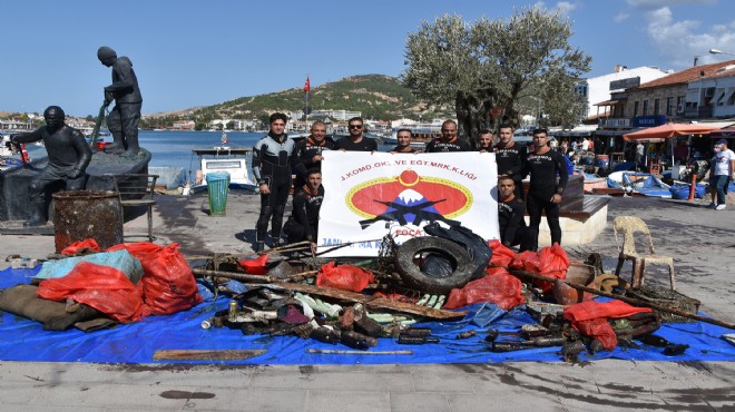 Küçükdeniz Limanındaki su altı temizliğinde çıkarılan şişe, cam, plastik, karton, metal, kumaş ve benzeri atıklar, üzerindeki canlılar denize bırakıldıktan sonra sergilenirken çevre kirliliğinin çarpıcı boyutlarını bir kez daha gözler önüne serdi.