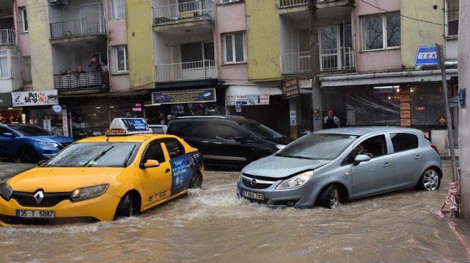 İzmir’de etkili olan sağanak nedeniyle cadde ve sokaklar göle döndü, sürücüler trafikle ilerlemekte zor anlar yaşadı.