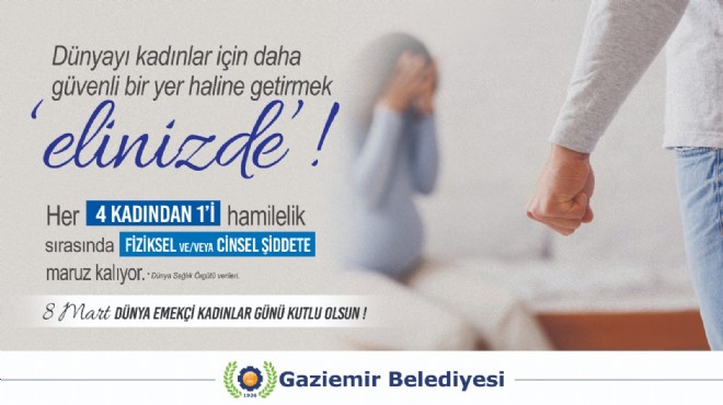 Gaziemir Belediyesi, 8 Mart Dünya Emekçi Kadınlar Günü’nde özel bir çalışmayla kadınların yaşadığı sorunlara dikkat çekti. Belediye, Dünya Sağlık Örgütünün kadınların yaşadığı sorunlara dikkat çektiği raporundaki verileri ilan panolarına taşıdı. Kadına şiddete dikkat çeken fotoğraflara ve kadınların yaşadığı psikolojik, fiziksel ve cinsel şiddetin boyutlarını gösteren rakamlara yer verilen görsel ilçenin dört bir yanındaki ilan panolarına asıldı.