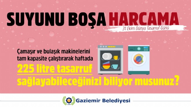 Meteoroloji Genel Müdürlüğü ve NASA’nın yayınladığı haritalar, Türkiye’nin karşı karşıya olduğu kuraklık sorununu gözler önüne seriyor. Doğal Hayatı Koruma Vakfı’na göre Türkiye'de aralarında İzmir’in de olduğu toplam 10 kent, küresel ölçekte yüksek susuzluk riski ile karşı karşıya. Gaziemir Belediyesi, yurttaşların dikkatini bu soruna çekmek için farkındalık çalışmaları yapmaya devam ediyor. Daha önce yaptığı çalışmayla barajların doluluk oranlarına, 22 Nisan Dünya Su Günü’nde hazırladığı görsel çalışmayla yiyecek, içecek, ayakkabı ve giysi ürünlerinin üretim sürecinde harcanan su miktarına dikkat çeken belediye, 31 Ekim Dünya Tasarruf Günü’nde de özel bir farkındalık projesine imza attı. Belediye, hazırladığı görsellerle her bireyin alacağı küçük önlemlerle yapacağı su tasarrufuna dikkat çekti.