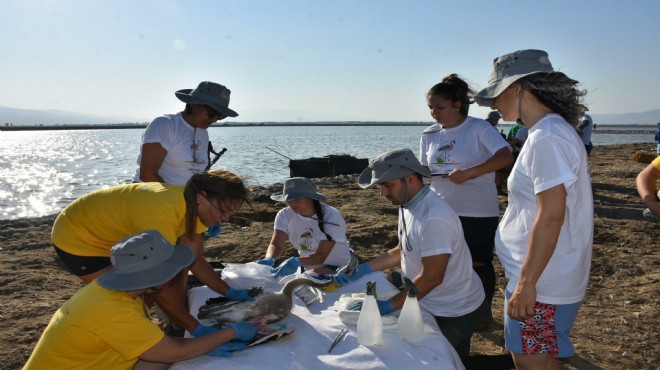 Ege Üniversitesi Fen Fakültesi'nden Doç. Dr. Ortaç Onmuş, "Bu adada 16 bin çift flamingo ürüyor. Yaklaşık da 14 bin yavrumuz var. Sabah 04.00'te halkalama çalışması başladı. 110 kişilik bir ekibimiz var. Ekibimiz yavru flamingoları kapalı bir alana sürdü. 500 flamingoyu halkalayacağız. Flamingo kendi besini olan tuzla karidesi olarak bilinen artemiaları besin olarak tüketiyor. Sindiremediği artemia yumurtalarının doğada üremesini sağlayan bir türdür. Artemia larvaları ise tüm doğadaki balık larvalarını besleyen canlıdır. Flamingoya hayatta tutarak balıkçılığı koruyoruz. Dün Bakan Yardımcımız ve Doğu Koruma yetkilileri de buraya geldiler. Yaptığımız halkalama ile flamingoların İspanya ve İtalya gibi ülkelere gittiğini gördük. Oraya göç eden flamingolar bu ülkelerdeki balıkçılığı da aynı yöntemle koruyorlar" dedi.