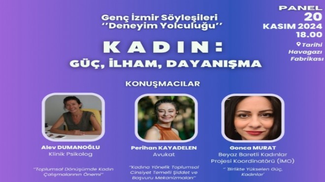 Kent genelinde hayata geçirilen projelerle gençlerin fırsat eşitliği gözetilerek sosyal yaşamın temel gereksinimlerinden yoksun kalmaması için çalışan İzmir Büyükşehir Belediyesi ilgi çekici etkinliklere imza atıyor. Bu kapsamda "Genç İzmir Söyleşileri Deneyim Yolculuğu Programı" başlığıyla her ay düzenlenen etkinlikler dizisinin bu ayki teması; "Kadın: Güç, İlham, Dayanışma" olarak belirlendi.
