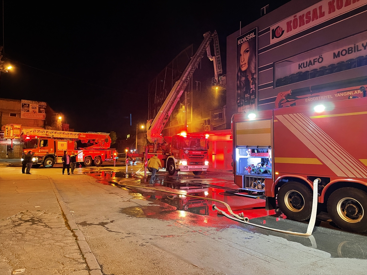 Yangının bitişikteki iş yerlerine sıçmaması için yoğun çaba harcayan ekipler, bir iş yerinin de kepenklerini keserek içeride biriken dumanı tahliye etti. (AA)