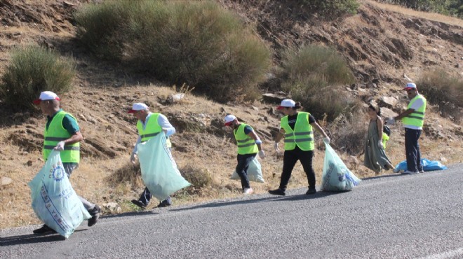 Ödemiş Belediyesi öncülüğünde gerçekleştirilen çevre temizliğine katılanlar, Avcılar Çeşmesi ve Ödemiş arasındaki 15 kilometrelik kara yolu çevresindeki çöpleri topladı.