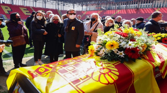 Üzerinde takım bayrağı ve 9 numaralı forması olan naaş, takım arkadaşları ile Göztepelilerin omuzları üstünde stattan uğurlanarak Hocazade Camisi'ne getirildi.