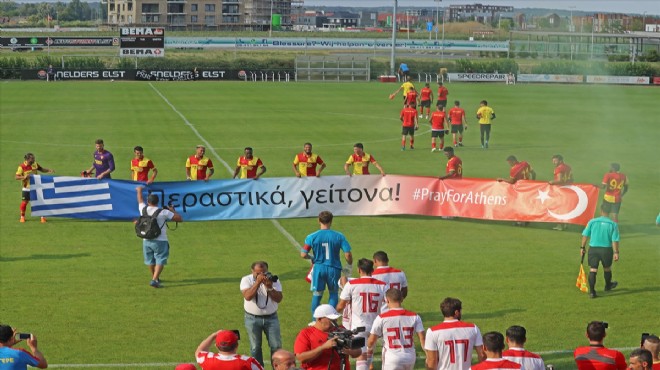 Hollanda'nın Arnhem bölgesinde oynanan maça İzmir ekibi, Yunanistan'ın başkenti Atina yakınlarında yaşanan yangın felaketi nedeniyle üzerinde Yunanca "Geçmiş olsun komşu" yazılı pankartla çıktı.