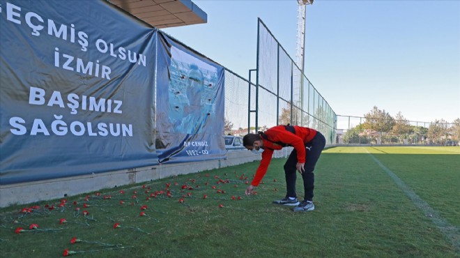 Adnan Süvari Tesislerindeki antrenman sahasının kenarına asılan "Geçmiş olsun İzmir, başımız sağolsun" yazılı pankartta depremde hayatlarını kaybeden bir dönem Göztepe'de staj yapan Ali Çağın Kaygusuz ve sarı-kırmızılı taraftar Alp Cengiz'in fotoğrafları yer aldı.
