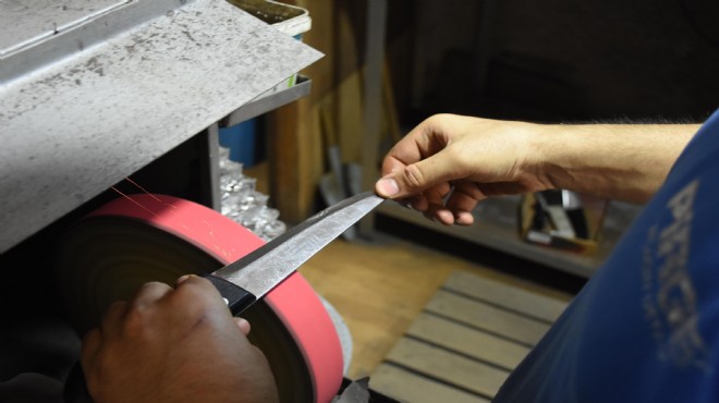 Kemeraltı Çarşısı'nda bıçak imalatı ve satışı yapan Adnan Dörtkaş, kurban keserken 2 ve 3 numaralı bıçakların kullanılması gerektiğini belirterek, "Kurban Bayramı'nda bıçak satışlarımız çok iyi. Bıçaklarımıza talep var, yoğun bir şekilde çalışıyoruz. İnsanlarımıza tavsiyem, bıçaklarını işin uzmanlarına biletsin. Çünkü bu işin vebali var. Kurbanı keserken 2 ile 3 numara bıçaklar daha uygundur. Bileme işimiz de yoğun bir şekilde devam ediyor" dedi.