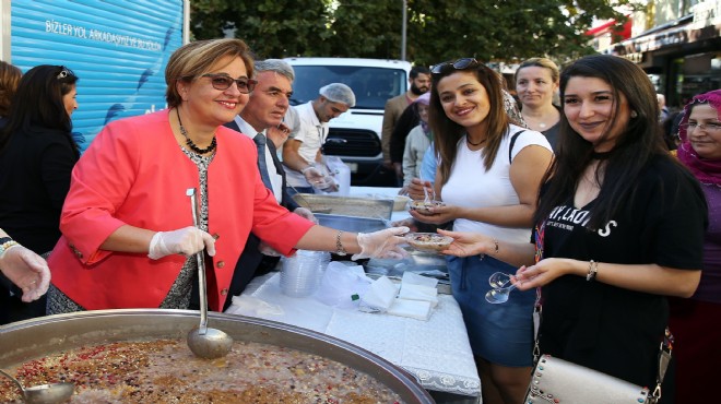 Alsancak Gündoğdu Meydanı’nda kurulan şenlik alanını dolduran İzmirlilere aşure dağıtımı yapan Başkan Pekdaş, “Biz bugün burada aşure kazanımızı İzmir Büyükşehir Belediyesi’nin Yerel Üretim Şenliği’nde kurduk. Alsancak Gündoğdu Meydanı’na şenlik için İzmir’in dört bir yanından gelen kooperatif üyeleriyle birlikte olduk. Hem onların ürünlerini tattık, onlarla deneyim paylaştık hem de aşure aşımızı paylaştık. Bereketimiz tüm İzmir’e tüm ülkeye yayılsın diyerek dileklerde bulunduk. Türkiye aydınlık bir Türkiye olsun, tarımı bereketli olsun” diye konuştu. Pekdaş, aşure dağıtımının ardından şenlik alanındaki stantlarını gezerek üreticileri stantlarında ziyaret etti. Öte yandan Konak Belediyesi’nin Muharrem ayı dolayısıyla başlattığı aşure dağıtımları 25 Ekim’e kadar devam edecek. İlçenin farklı noktalarında kurulacak aşure kazanlarından toplam 18 bin kişilik aşure ikramı yapılacak.