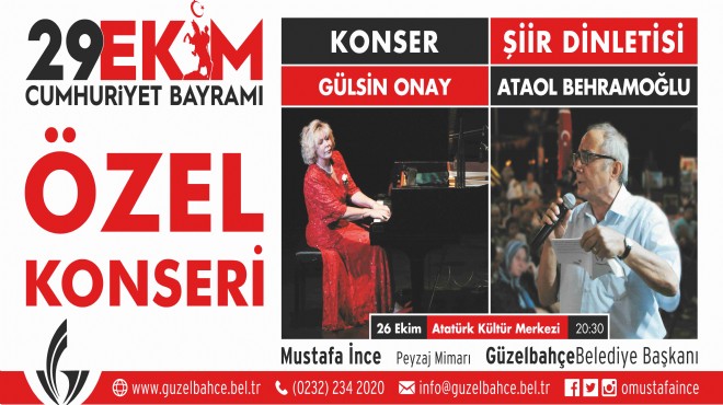 26 Ekim Perşembe Saat 20.30: Ünlü Piyanist Gülsin Onay “Cumhuriyet konseri” verecek. Ardından Şair Ataol Behramoğlu “Şiir dinletisi” sunacak.