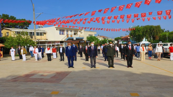 Güzelbahçe’de Koronavirüs nedeniyle 19 Mayıs töreni, sosyal mesafe dikkate alınarak çelenk töreni düzenlendi.