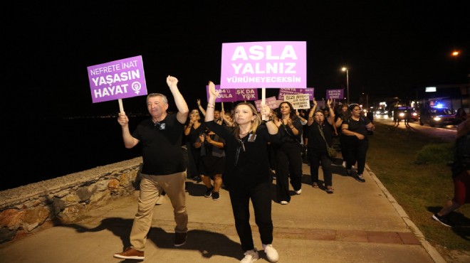 Güzelbahçe Beldiyesi tarafından düzenlenen yürüyüşte “Kadına kalkan eller kırılsın”, “Kadın, Yaşam Özgürlük”,”İstanbul Sözleşmesi Yaşatır” ve “Susmuyoruz, korkmuyoruz, itaat etmiyoruz” şeklinde sloganlar attıldı, dövizler taşındı.