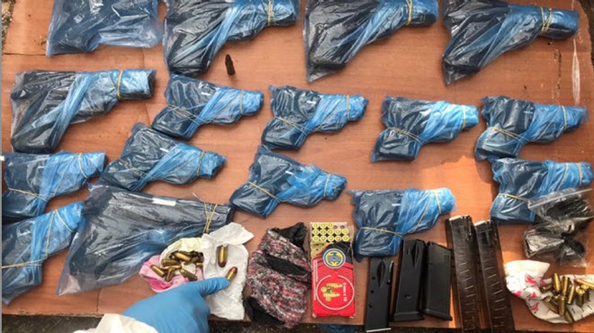 Yapılan aramada değişik noktalarda gömülü halde, 9 mm çapında üzerinde seri numarası bulunmayan Sıg Sauer P 226 marka 13 tabanca, 7,65 mm çapında üzerinde seri numarası bulunmayan Sıg Sauer P 226 marka 11 tabanca, 9 mm çapında 12 tabanca şarjörü (2'si uzun şarjör), 7,65 mm çapında 39 tabanca şarjörü, ibaresiz çifte doldurma av tüfeği, bol miktarda değişik çap/marka tabanca fişeği, 100 lt hacminde doldur-boşalt olarak kullanılan mavi renkli plastik bidon, Mengene Aleti, silah bakım temizlik malzemeleri, 10-15 lt hacminde 2 plastik bidon, (15 lt içinde tabancalar elde edilmiştir) Üzerinde Kelime-i Tevhid ibarelerinin yer aldığı yeşil renkli sözde cihad bayrağı, akıllı cep telefonu ve sim kartı, 5 sprey boya kutusu, R.G. adına düzenlenmiş yeni kimlik kartı ele geçirildi. (DHA)