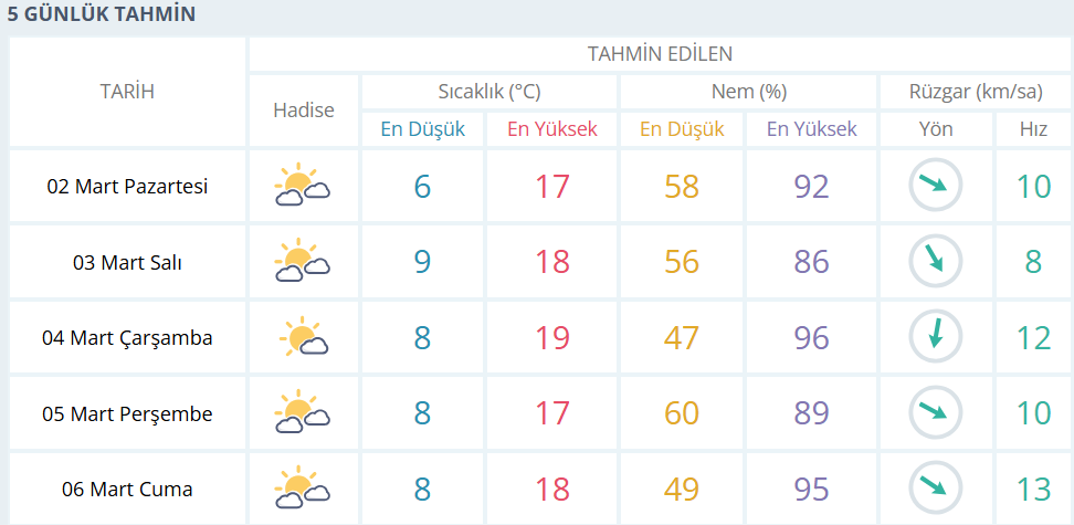 Perşembe günü ise yine parçalı bulutlu 17 derece olacak.