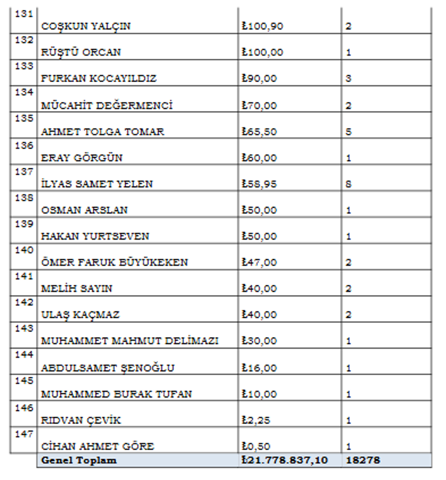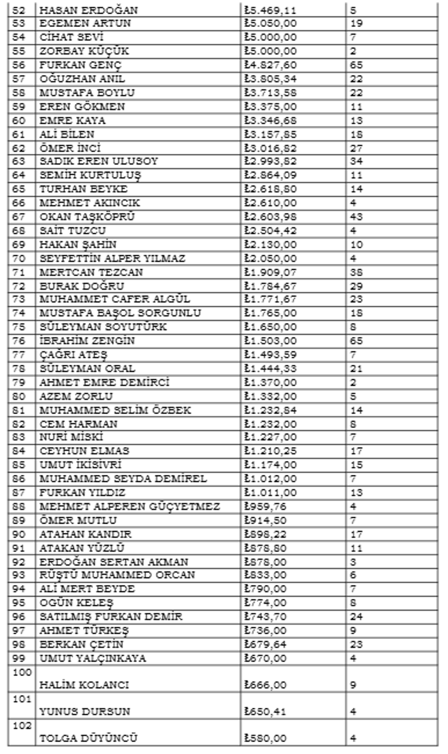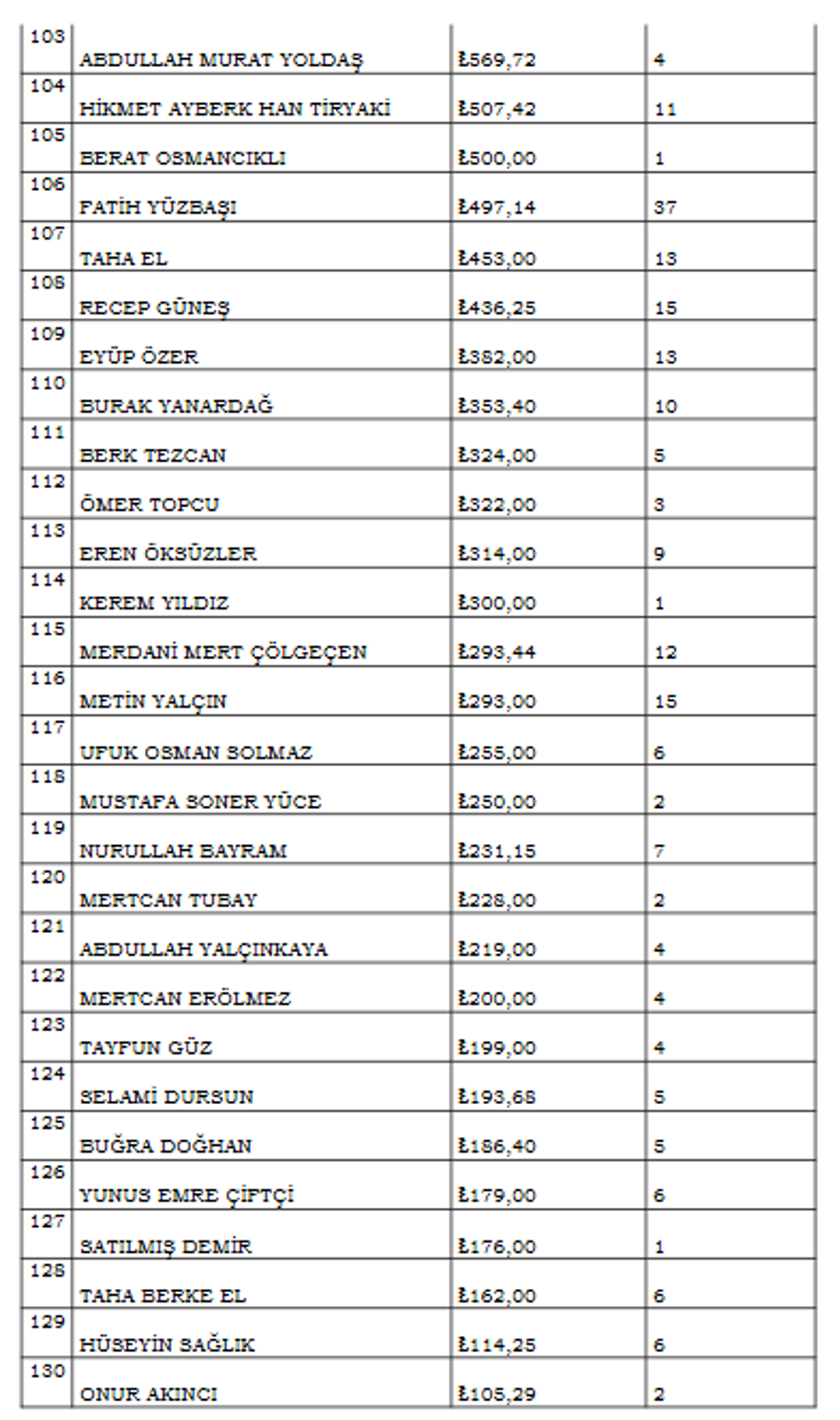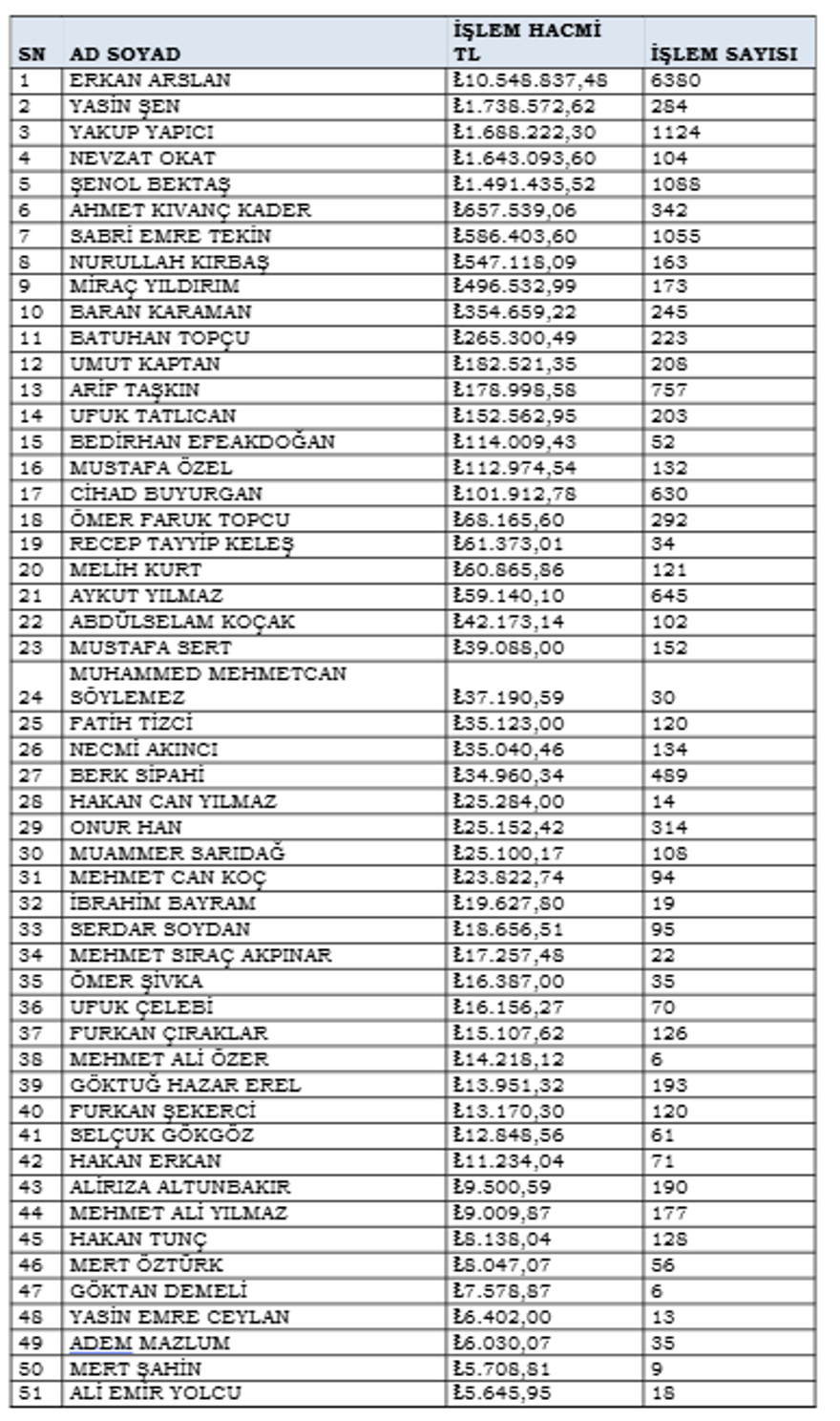 HAKEMLERİN İSİMLERİ VE İŞLEM HACİMLERİ İSE ŞÖYLE: