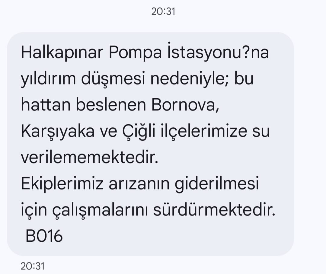 Ekiplerin arızanın giderilmesi için çalışmalarını sürdürdüğünü belirtilirken vatandaşlara söz konusu kesintiye ilişkin bilgilendirme mesajları paylaşıldı. İZSU'dan tarafından atılan kısa mesaj ile İzmirliler bilgilendirildi.