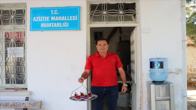 Odanın bir bölümüne imece usulü alınan çay kazanını yerleştiren Yılmaz, dışarıya koyduğu masa sandalyeler ile mahalleliyi muhtarlığında ağırlıyor.