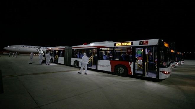 Türk Hava Yolları uçağıyla Adnan Menderes Havalimanı'na getirilen 1'i çocuk 87 Türk vatandaşı, uçakta gerçekleştirilen sağlık ve pasaport kontrollerinin ardından kendilerini bekleyen otobüslere bindirildi.
