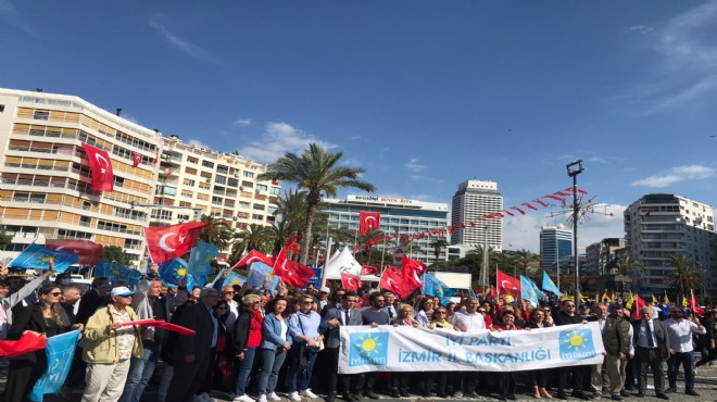 Cumhuriyet Meydanı'nda Atatürk heykeline çelenk bırakan İYİ Parti İzmir İl Başkanı Hüsmen Kırkpınar ve partililer daha sonra kortej şeklinde Gündoğdu Meydanı'na yürüdü.