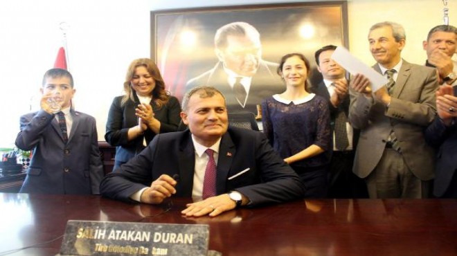 Daha sonra Belediye binasına giren Duran, seçimde 20 bin 923 oy fark attığı DSP'li mevcut Belediye Başkanı Tayfur Çiçek'ten görevi devraldı. Çiçek devir teslim töreni sırasında yaptığı konuşmada, "Bugün görevimi 15 yıl şeref ve gururla yaptıktan sonra meydanlarda söyleyemedim, bir öğrencime teslim ediyorum. Boynuz kulağı geçer bilirsiniz. Ben de ondan çok şey bekliyorum. Telefon numaralarım onun önünde olacak. Ne zaman ihtiyacı olursa eski bir hocası olarak kendisine yardımcı olacağım. 1999 yılında başkan olduğumda bir ağabeyimiz bana 2 tavsiyede bulunmuştu, ben de aynı tavsiyeleri Atakan kardeşime verip, 'Kimsenin ekmeği ile oynama ve her şeyin çaresi vardır' diyorum. Hayırlı uğurlu olsun. Kendisi de ilerleyen günlerde performansıyla bunu gösterecektir" diye konuştu.(DHA)