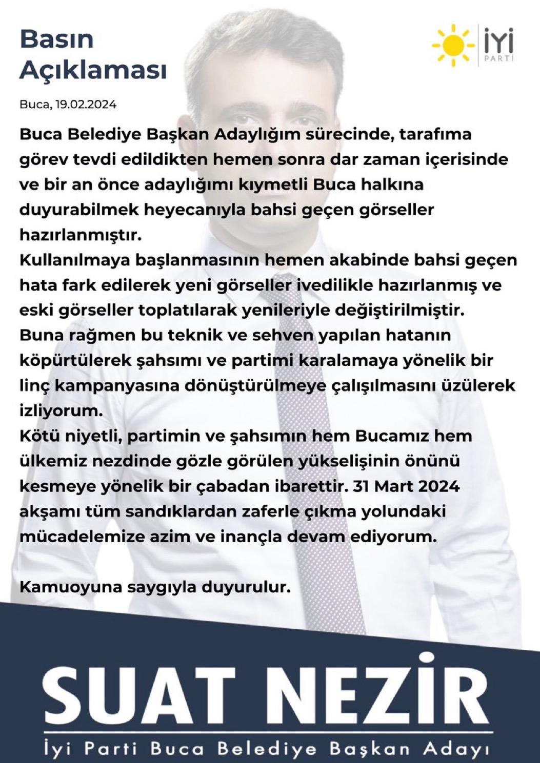 Flaş transferin ardından saha çalışmalarına başlayan İYİ Parti Buca Belediye Başkan Adayı Suat Nezir bu kez seçim afişleriyle gündeme geldi. Afişlerde kullanılan fotoğraflarda Nezir'in yakasında CHP rozeti bulunması dikkat çekti.