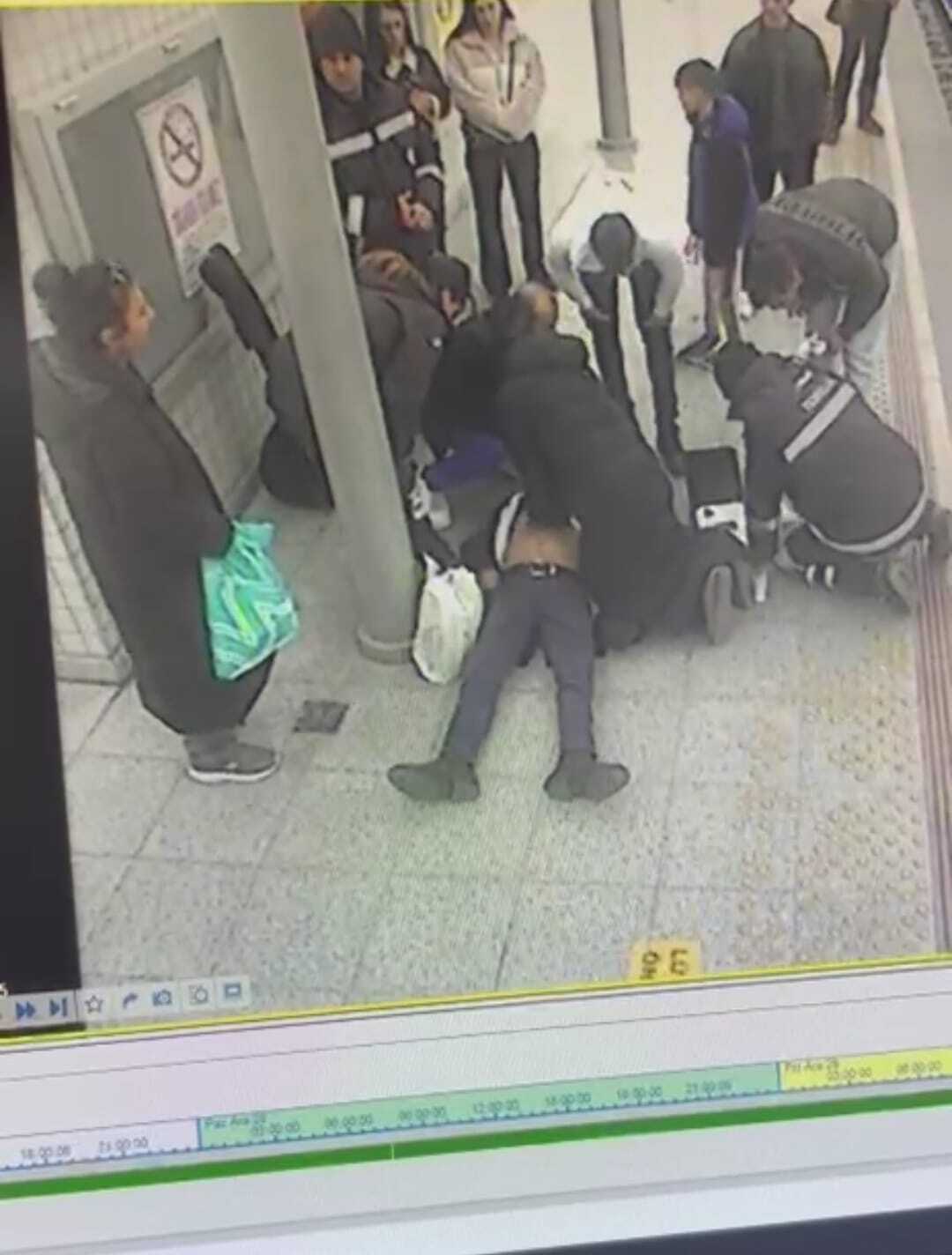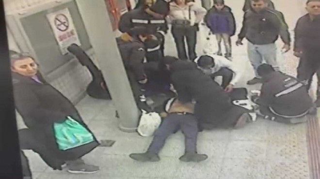 Olay saat 16.40 sıralarında İZBAN Çiğli İstasyonu’nda meydana geldi. Peronda tren bekleyen Hamit Öğretim (73), fenalaşarak düştü. O sırada tren bekleyen bir sağlık çalışanı, Öğretim’in kalp krizi geçirdiğini ve nabzının atmadığını tespit edip kalp masajı yaptı. Sağlık çalışanı, istasyonda bulunan taşınabilir şok cihazı (OED) ile de hastaya müdahale etti ve hastadan nabız alındı. Hastaya kalp masajıyla müdahale sürerken istasyona gelen sağlık ekiplerince Öğretim, Çiğli Eğitim ve Araştırma Hastanesi’ne kaldırıldı. Olay istasyonun güvenlik kamerasınca da kaydedildi. Görüntülerde sağlık çalışanının hastaya müdahale ettiği görüntüler yer aldı. Hastanedeki tedavisi süren Öğretim’in entübe edildiği ve durumunun ağır olduğu öğrenildi. (DHA)