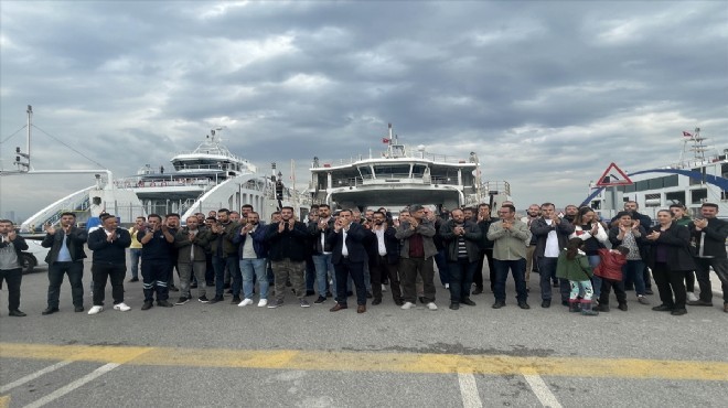 Bostanlı İskelesi'nde bir araya gelen Türkiye Denizciler Sendikası üyesi bir grup İZDENİZ AŞ çalışanı, saat 18.00'de çalan vapur düdüklerine alkışlarla destek verdi.