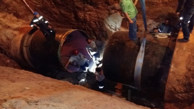 Menemen Turgut Özal Bulvarı üzerinde bulunan ve Göksu-Sarıkız kuyularından İzmir’in Bayraklı, Karşıyaka, Çiğli, Bornova ilçelerine su temin eden 2 metre 20 santim çapındaki ana boruda arıza tespit eden İZSU ekipleri, arızanın giderilmesi için seferber oldu.