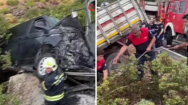 Çarpışmanın etkisiyle minibüs yoldan geri kayarak şarampolde kayalıklara sıkıştı. Kamyonetin de ön bölümü uçuruma doğru kaydı.
