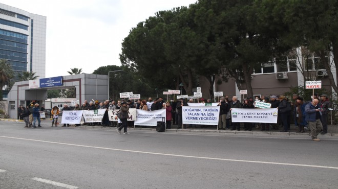 Foça’da Taş Ocağı kurulmasını kabul etmeyen Foça’da Tarih Doğa Talanına Hayır Platformu üyeleri ve sivil toplum örgütleri; İzmir Çevre, Şehircilik ve İklim Değişikliği İl Müdürlüğü binası önünde bir araya geldi.