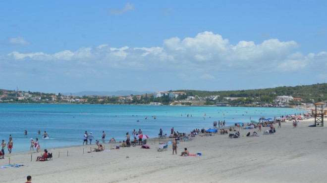Çeşme'deki Ilıca Plajı'na gelenler, sıcak havanın ve denizin keyfini sürdü. Sahildeki bazı kişiler, sosyal mesafeyi korumak için yapılan localarda oturup, vakit geçirdi.