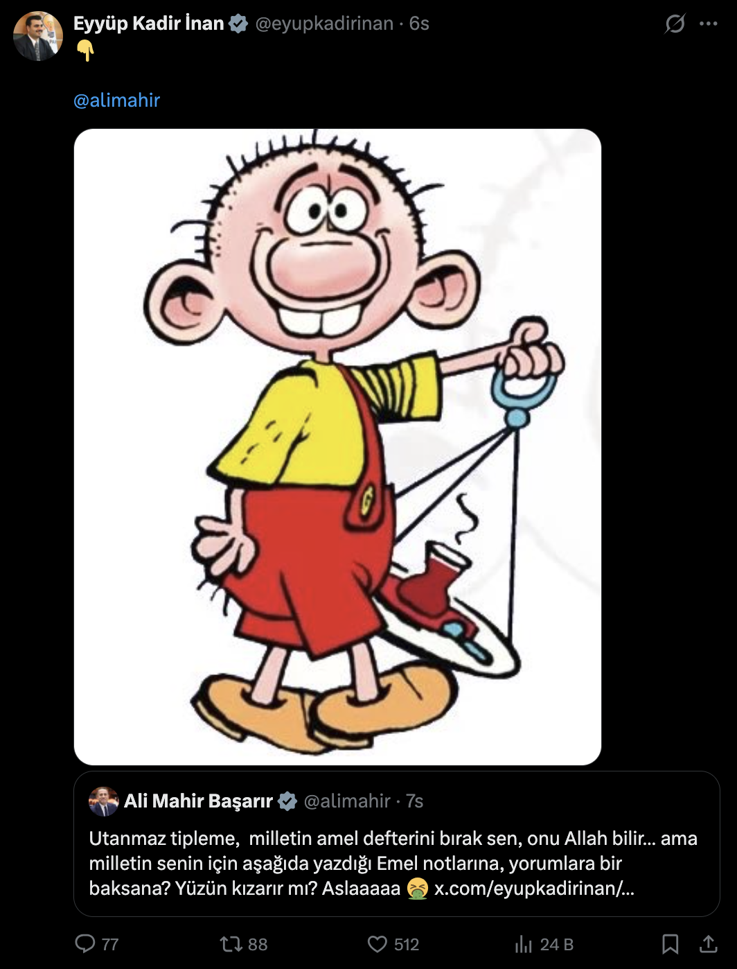 İnan’ın paylaşımına CHP’li Başarır’dan sert yanıt geldi. Başarır, “Utanmaz tipleme, milletin amel defterini bırak sen, onu Allah bilir… ama milletin senin için aşağıda yazdığı notlara bir baksana? Yüzün kızarır mı? Asla?” sözleriyle tepki gösterdi.