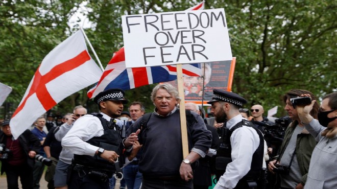 Hükümetin tecrit politikalarına karşı çıkan bir grup parkta toplandı. Salgına karşı alınan önlemleri protesto etti.