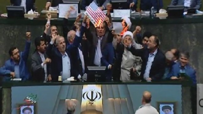 ABD'nin nükleer anlaşmadan çekilmesine tepki gösteren İranlı milletvekillerinden bazıları da meclisteki oturum sırasında ABD bayrağını ve nükleer anlaşma metnini yaktı.