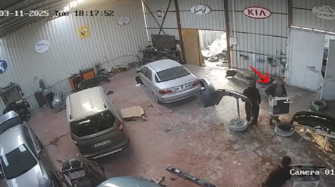 Güvenlik kamerasınca kaydedilen görüntülerde, şüphelilerin olay yerine 2 ayrı araçla gelmesi, zanlılardan birinin kompresör makinesini araca yüklemesi, itiraz eden iş yeri sahibini darbedip silah çekmeleri yer alıyor. (AA)