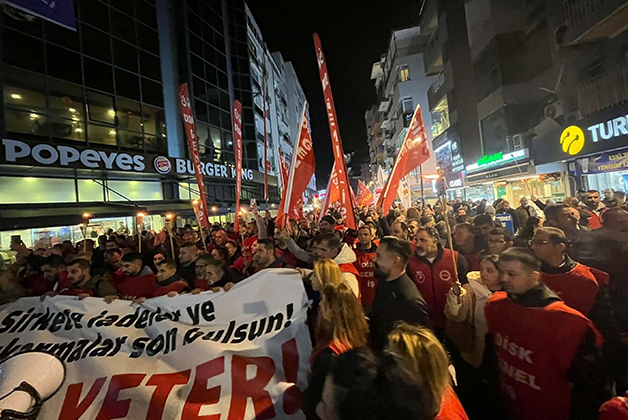 İzmir Büyükşehir Belediyesi iştirakleri İZENERJİ, İZELMAN, İZFAŞ, EGEŞEHİR ve İZTEK aylardır ödenmeyen haklar, TİS haklarının yatmaması, maaşlarının eksik yatırılması, işten çıkarılanlar, çalıştıkları şirkete iade edilmelerine rağmen işbaşı yaptırılmayan üyeler ve ücretlere yönelik haksız uygulamalar nedeniyle DİSK/Genel-İş İzmir 1, 2, 3 ve 9 No’lu Şube üyeleri ve 23 bin işçi başlattıkları eylem, ikinci gününde de devam etti. Eylemin ikinci gününde bir araya gelen işçiler, Kültürpark Lozan kapısından Alsancak Kıbrıs Şehitleri Caddesindeki Türkan Saylan Kültür Merkezine kadar meşalelerle yürüdü. Yürüyüşün ardından Türkan Saylan Kültür Merkezinin önünde basın açıklamasında bulunan DİSK/Genel-İş İzmir 2 Nolu Şube Başkanı Ercan Gül, "Günlerdir burada ciddi mücadeleler veriyoruz. Sokağa çıktık. Çünkü haklarımızı alamıyoruz. Masada çözüm bulmak için elimizden geleni yaptık. Masada her defasında ‘Gelin birlikte bu sorunu burada çözelim, sokaklara taşmasın’ dedik. Ama maalesef bizleri anlayan, dinleyen olmadı" dedi.