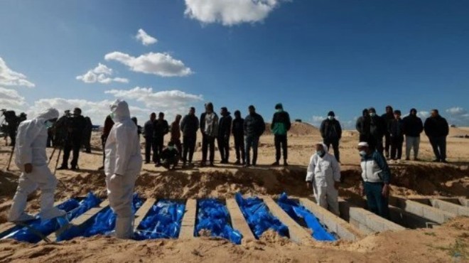 Aylardır devam eden katliamda öldürülen binlerce insan için mezarlıklarda yer bulamayan Gazze halkı cenazelerini toplu mezarlara gömmek zorunda kalıyor. (AA)